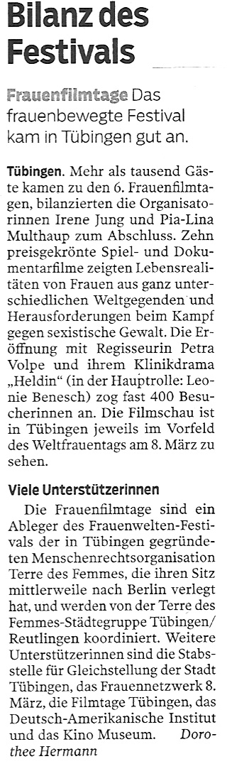 Hier auszugsweise das Medienecho zu den FrauenFilmTagen in Tübingen (wird noch ergänzt):