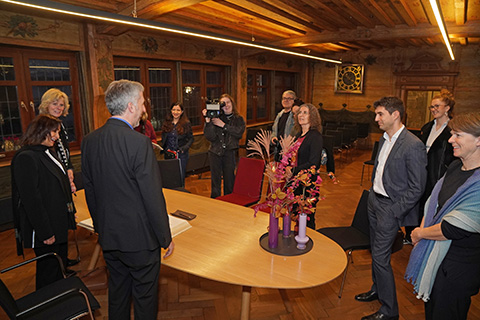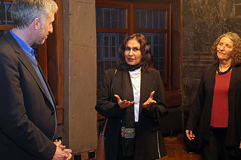Unser Ehrengast, die afghanische Botschafterin in Wien, Manizha Bakhtari, begann ihren Tag in Tübingen mit dem Besuch des Rathauses, wo sie von OB Boris Palmer empfangen wurde. Sie wurde dann eingehend in die Geschichte des Öhrn eingeführt und konnte die vielseitigen Malereien dort entdecken. Und ihrerseits dem OB und anwesenden Gemeinderatsmitgliedern und Presseleuten ein wenig ihre Situation als Botschafterin einer nicht mehr existierenden Regierung erklären, die von den Macht habenden Taliban als „entlassen“ erklärt wurde, diese „Entlassung" jedoch nicht akzeptiert, da die Taliban keine rechtmäßig Regierung präsentieren. Und besonders viel erzählt sie von den Schicksalen der Mädchen und Frauen, die in Afghanistan inzwischen einer Gender-Apartheid unterworfen sind.