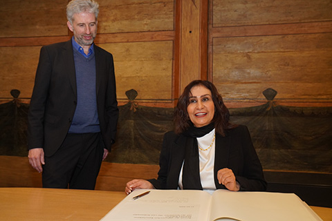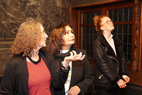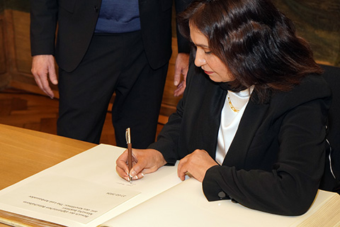 Im Beisein von Mitgliedern des Gemeinderates trug sie sich dann feierlich ins Goldene Buch der Stadt Tübingen ein und konnte auch erfahren, welche Persönlichkeiten aus der ganzen Welt sich schon vor ihr im Buch verewigt hatten. Danach wollte auch sie, wie schon viele unserer Gäste vor ihr, die einzigartige über 500-jährige astronomische Uhr des Rathauses kennenlernen. OB Boris Palmer konnte als Mathematiker wunderbar verständlich das Funktionieren dieser Uhr am Modell erklären, und wie die Sonnen-, Mond- und Drachenläufer jegliche Sonnen- oder Mondfinsternis auf der Erde voraussagen können. Die Tübinger Gemeinderätinnen, wollten jedoch noch mehr wissen über das gegenwärtige Leben der Mädchen und Frauen Afghanistans und hörten ihr fasziniert zu.