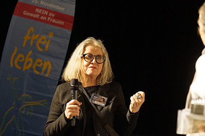 Auch nach der Vorführung führt sie noch weitere bewegte Gespräche am TERRE DES FEMMES-Infotisch.