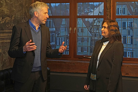 Unser Ehrengast, die afghanische Botschafterin in Wien, Manizha Bakhtari, begann ihren Tag in Tübingen mit dem Besuch des Rathauses, wo sie von OB Boris Palmer empfangen wurde. Sie wurde dann eingehend in die Geschichte des Öhrn eingeführt und konnte die vielseitigen Malereien dort entdecken. Und ihrerseits dem OB und anwesenden Gemeinderatsmitgliedern und Presseleuten ein wenig ihre Situation als Botschafterin einer nicht mehr existierenden Regierung erklären, die von den Macht habenden Taliban als „entlassen“ erklärt wurde, diese „Entlassung" jedoch nicht akzeptiert, da die Taliban keine rechtmäßig Regierung präsentieren. Und besonders viel erzählt sie von den Schicksalen der Mädchen und Frauen, die in Afghanistan inzwischen einer Gender-Apartheid unterworfen sind.