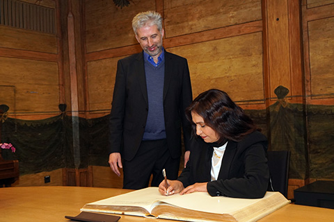 Im Beisein von Mitgliedern des Gemeinderates trug sie sich dann feierlich ins Goldene Buch der Stadt Tübingen ein und konnte auch erfahren, welche Persönlichkeiten aus der ganzen Welt sich schon vor ihr im Buch verewigt hatten. Danach wollte auch sie, wie schon viele unserer Gäste vor ihr, die einzigartige über 500-jährige astronomische Uhr des Rathauses kennenlernen. OB Boris Palmer konnte als Mathematiker wunderbar verständlich das Funktionieren dieser Uhr am Modell erklären, und wie die Sonnen-, Mond- und Drachenläufer jegliche Sonnen- oder Mondfinsternis auf der Erde voraussagen können. Die Tübinger Gemeinderätinnen, wollten jedoch noch mehr wissen über das gegenwärtige Leben der Mädchen und Frauen Afghanistans und hörten ihr fasziniert zu.