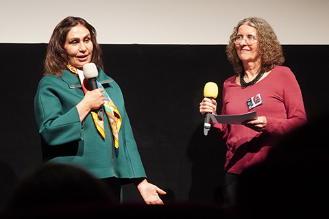 Danach ging es in den ausverkauften Kinosaal der Museums zur Vorführung des Dokumentarfilms THE LAST AMBASSADOR über ihr Leben und Engagement für die Frauenrechte in Afghanistan. In einem ausführlichen Publikumsgespräch konnte sie viel darüber berichten, wie fast wöchentlich immer neue weitere Einschränkungen von den Taliban eingeführt werden, die Frauen und Mädchen völlig aus der Öffentlichkeit verdrängen, sie unsichtbar und unhörbar machen wollen. Aber auch wie die internationale Politik mit der Problematik der Gender-Apartheit der Taliban umgeht. Und besonders erklärt sie eingehend, wie das von ihr ins Lebens gerufene „Daughter Programm“ funktioniert, in dem Frauen von hier aus Mädchen in Afghanistan unterstützen können: finanziell, online durch Mentorship, Fortbildung, und besonders durch solidarische Begleitung – denn nach 5 Jahren Taliban an der Macht sind diese Mädchen in Gefahr, den Mut und die Hoffnung zu verlieren. Der QR-Code macht es leicht, Menschen, die Unterstützung geben wollen, mit dem Programm zu verbinden. Manizha bekommt lang anhaltenden Applaus von einem bewegten und beeidruckten Publikum.